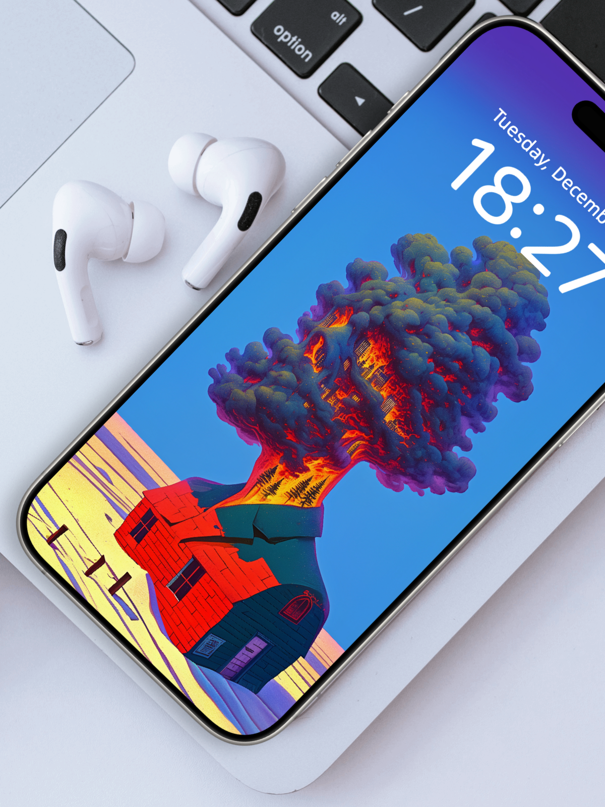 Transform your smartphone with this powerful overheating wallpaper. City Burning Under the Roof features a burning city erupting from a house, perfect for those seeking internal disaster phone backgrounds with surface calm themes.