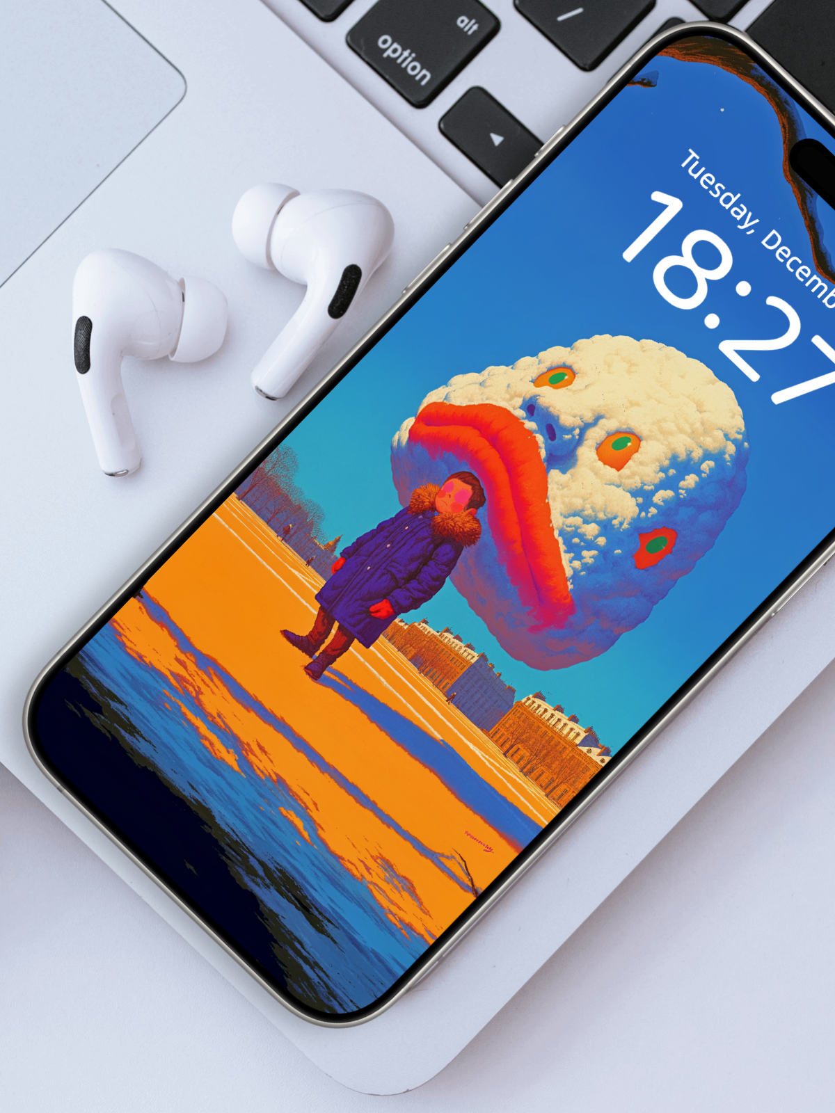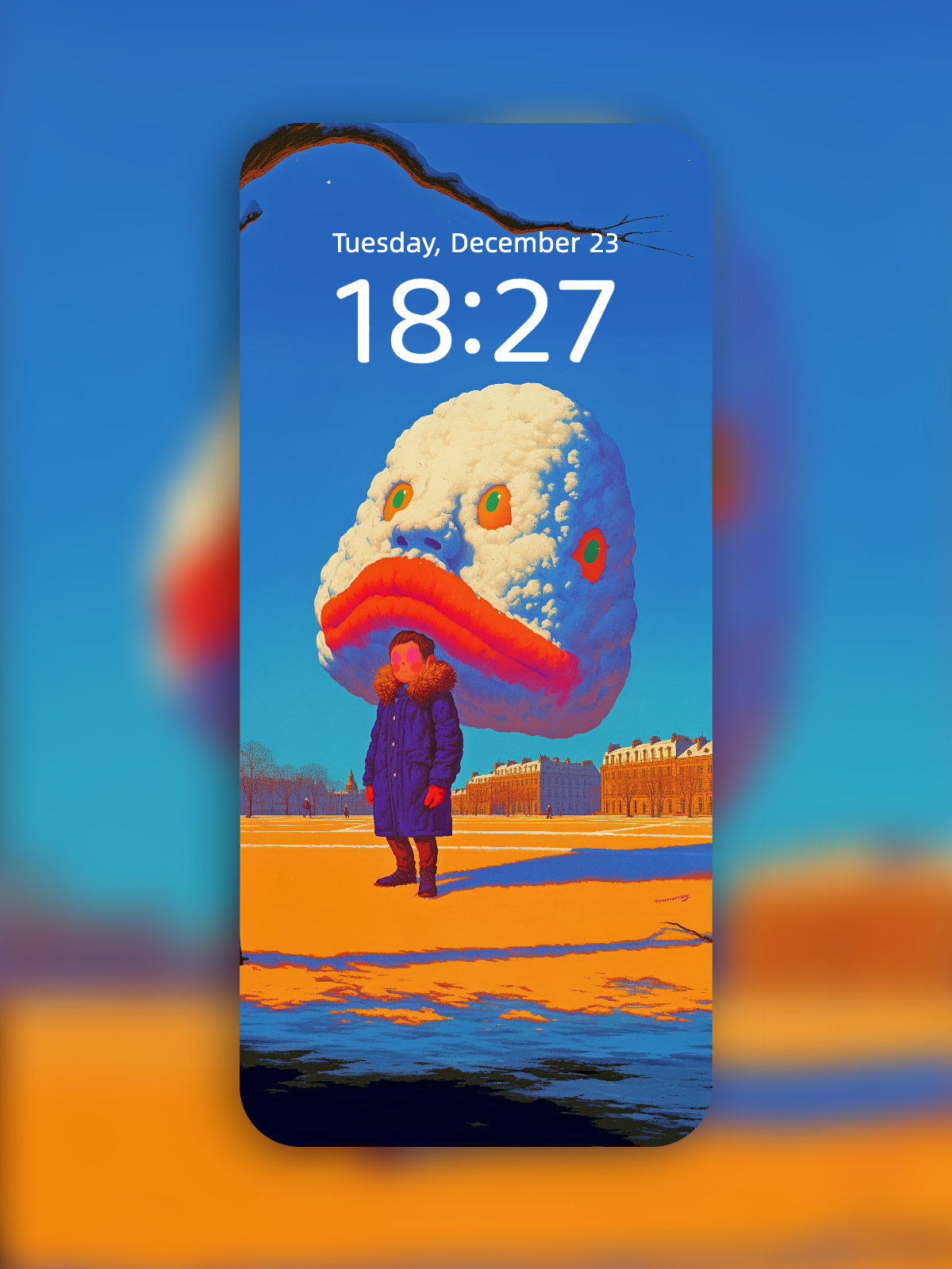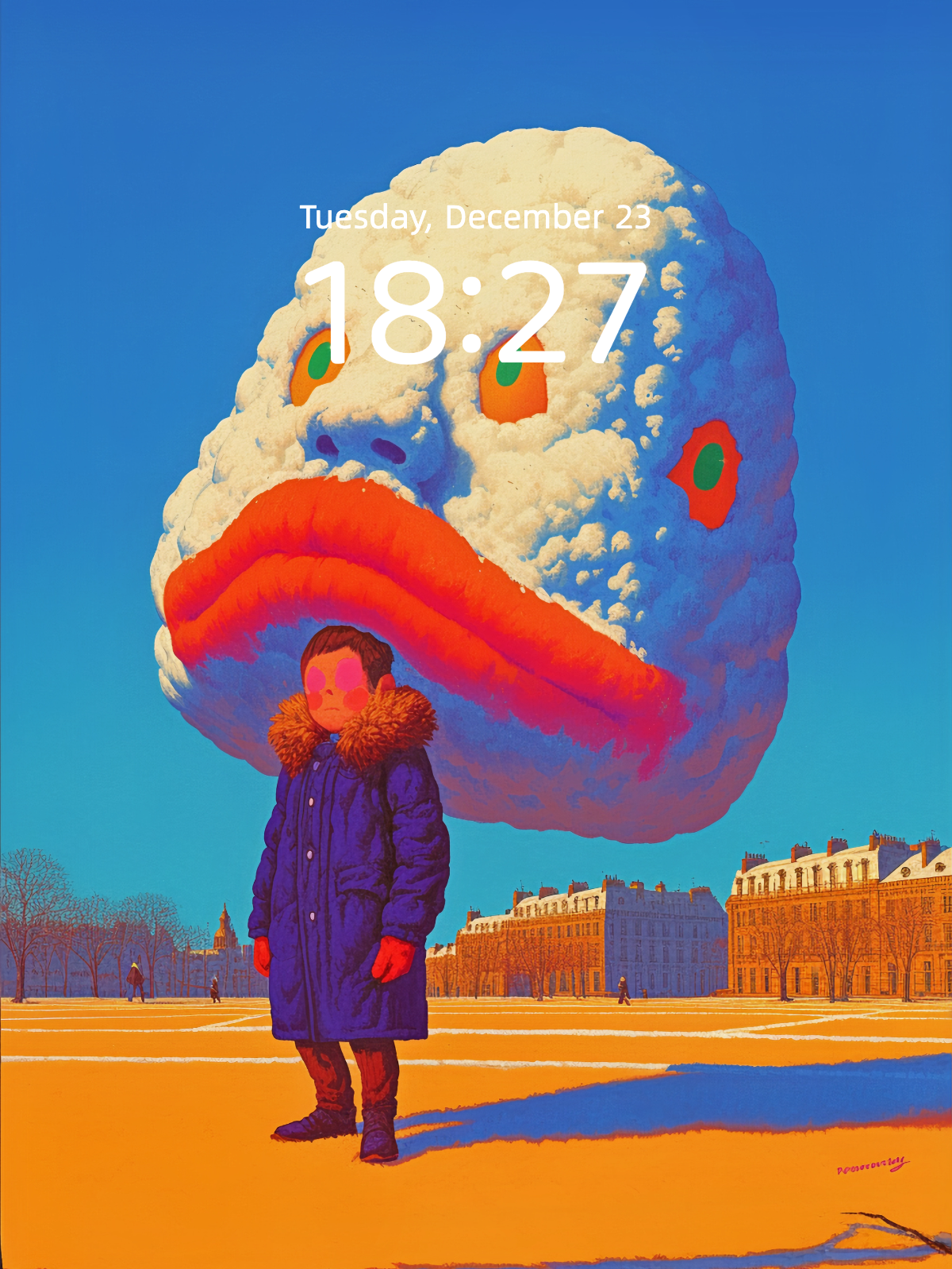 This childhood loneliness mobile wallpaper combines faceless children with giant cotton-cloud mascots. The frozen plaza creates a perfect oversized emotion phone wallpaper for those who feel too small while their inner weather feels far too big.