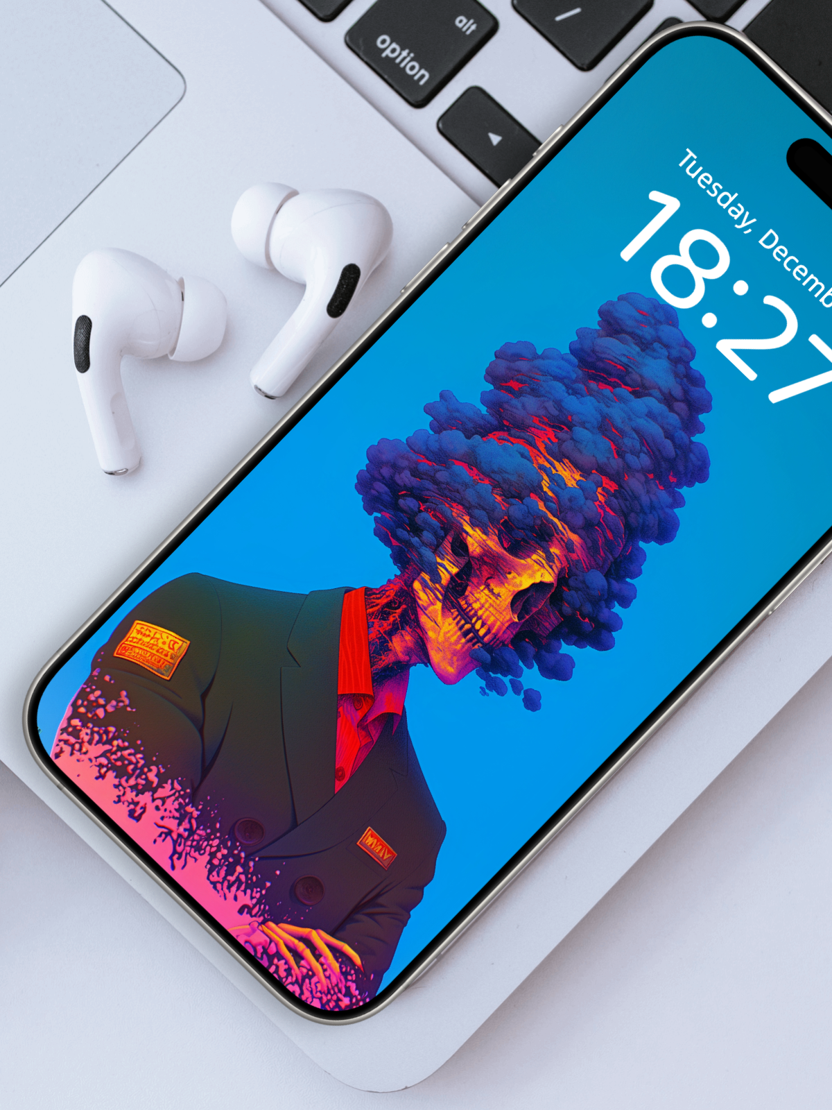 This nuclear burnout mobile wallpaper combines suited professionals with skull-shaped mushroom clouds. The blue smoke and orange glow create a perfect composed explosion phone wallpaper for those whose selves blur into smoke and bone.