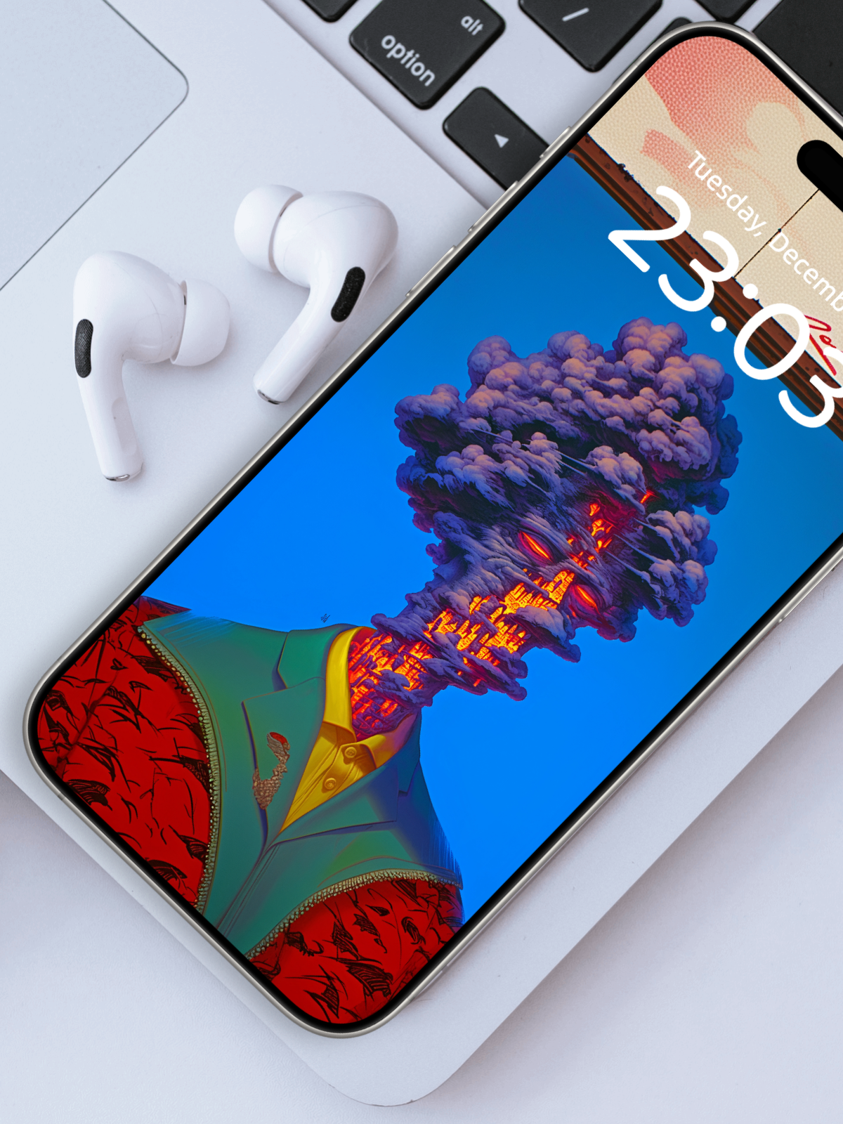 A whole city of lava and stone rises where a human face should be, climbing from collar to cloud as molten orange walls roar against a calm cyan sky and torn clouds fail to cool the heat—an overthinking portrait of mental noise, sharply dressed on the outside and burning non-stop within.