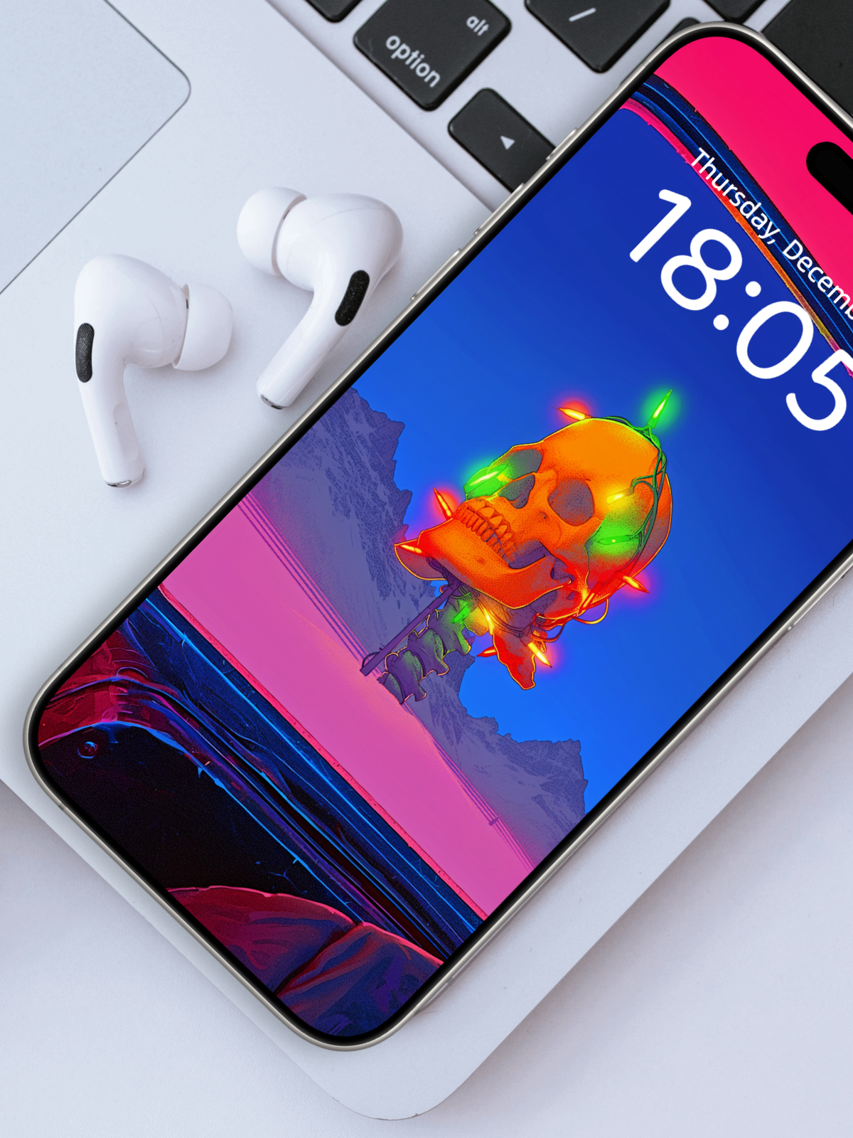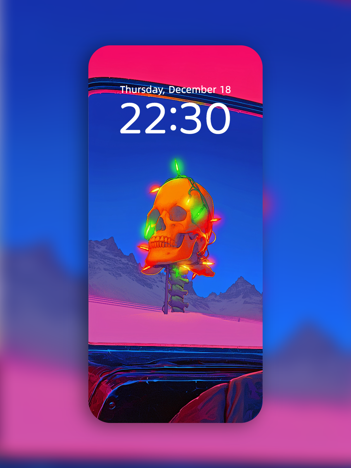 This road movie mobile wallpaper combines driver's seat views with neon skull beacons. The pink snowfield and mountains create a perfect quiet escape phone wallpaper for those fleeing a world that's too loud and too bright.