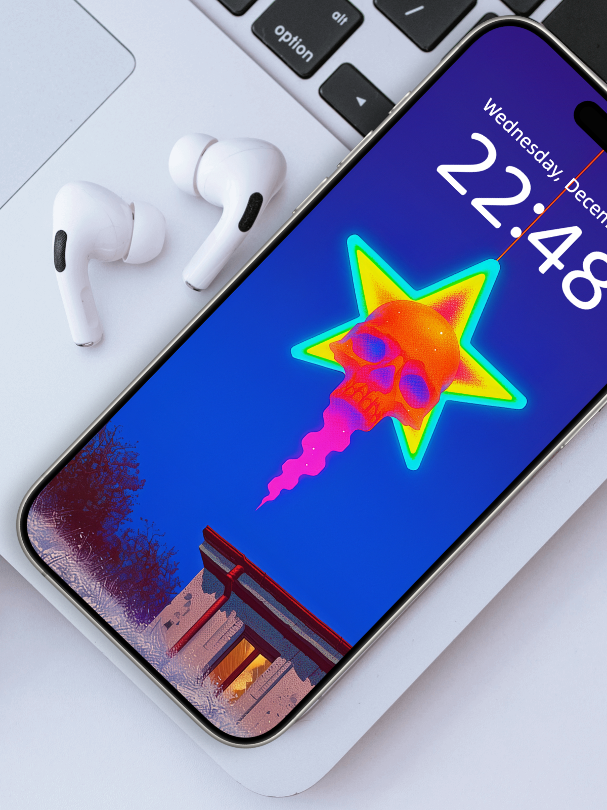 Night, rooftops, and the star lamp distill the scene into a brief poem—the skull becomes less a symbol of fear and more a whimsical guardian for your winter nights.