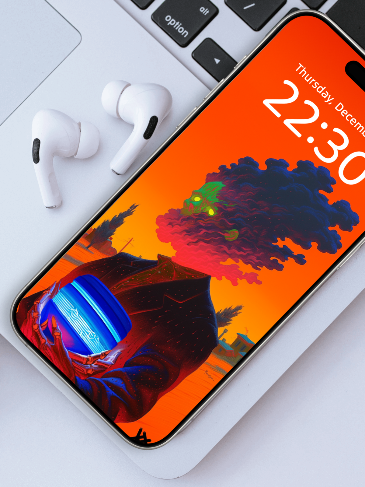This courier mobile wallpaper combines cloud-headed figures with glowing vessels of memories. The ocean wave stripes and skeletal fingers create a perfect unsent messages phone wallpaper for those who save drafts they never send.