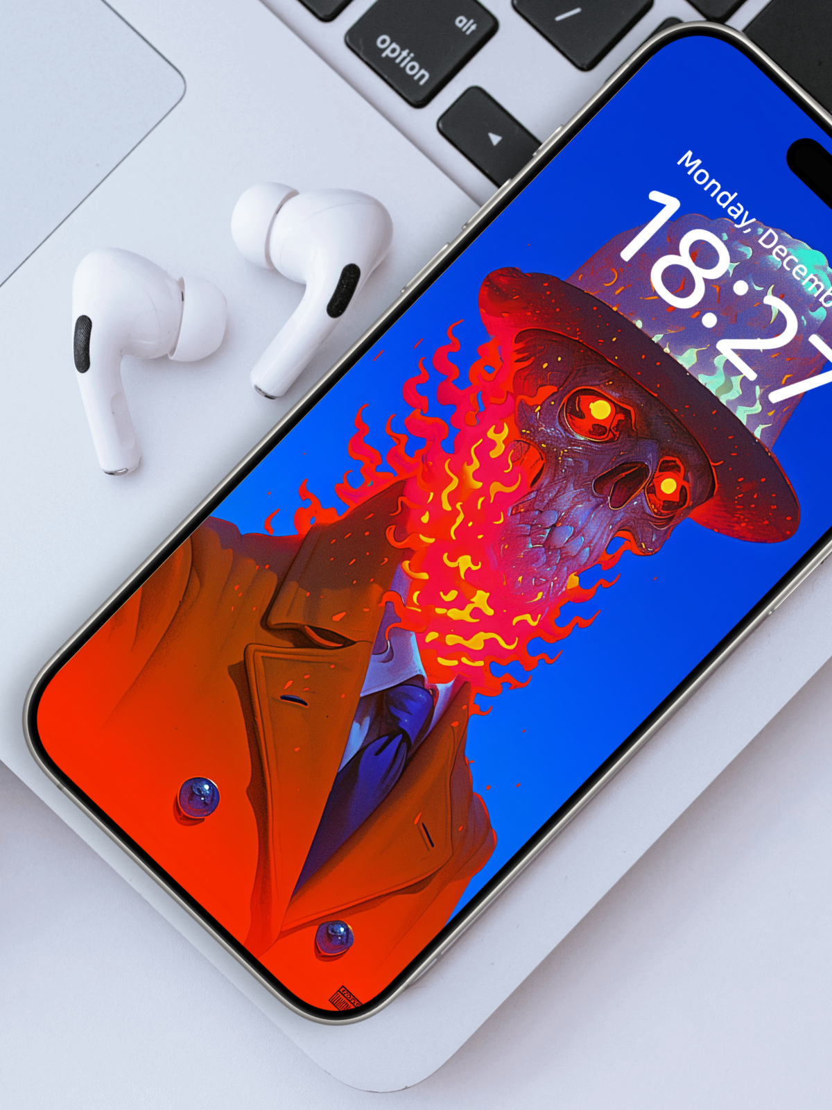 This professional mobile wallpaper combines skeletal gentlemen with roaring internal flames. The orange coat and blue tie create a perfect composed pressure phone wallpaper for those who work overtime to stay polite.