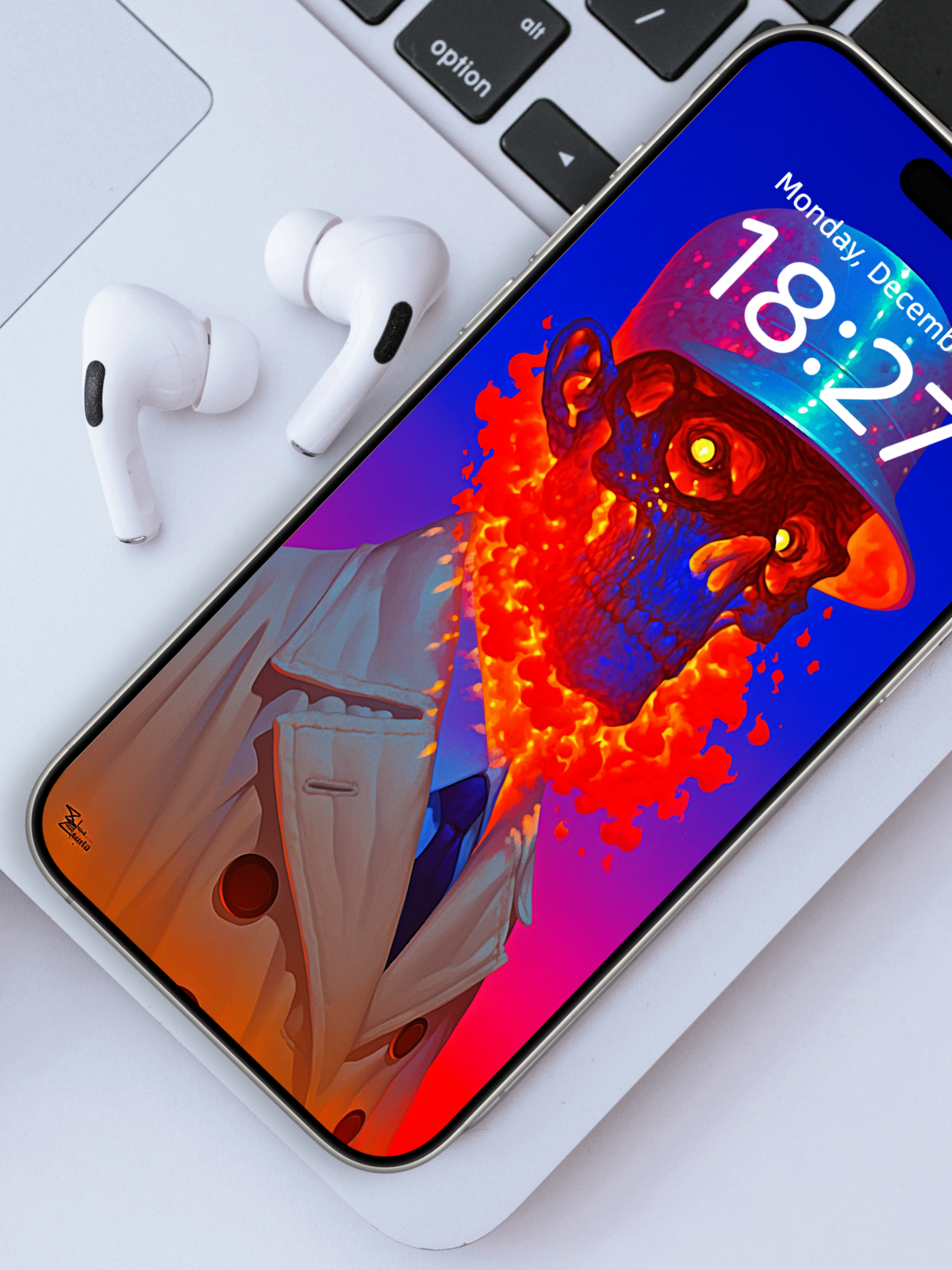 This post-storm mobile wallpaper combines translucent rain caps with fiery molten halos. The beige trench coat and blue-to-magenta sky create a perfect endurance phone wallpaper for those who survive storms and keep walking.