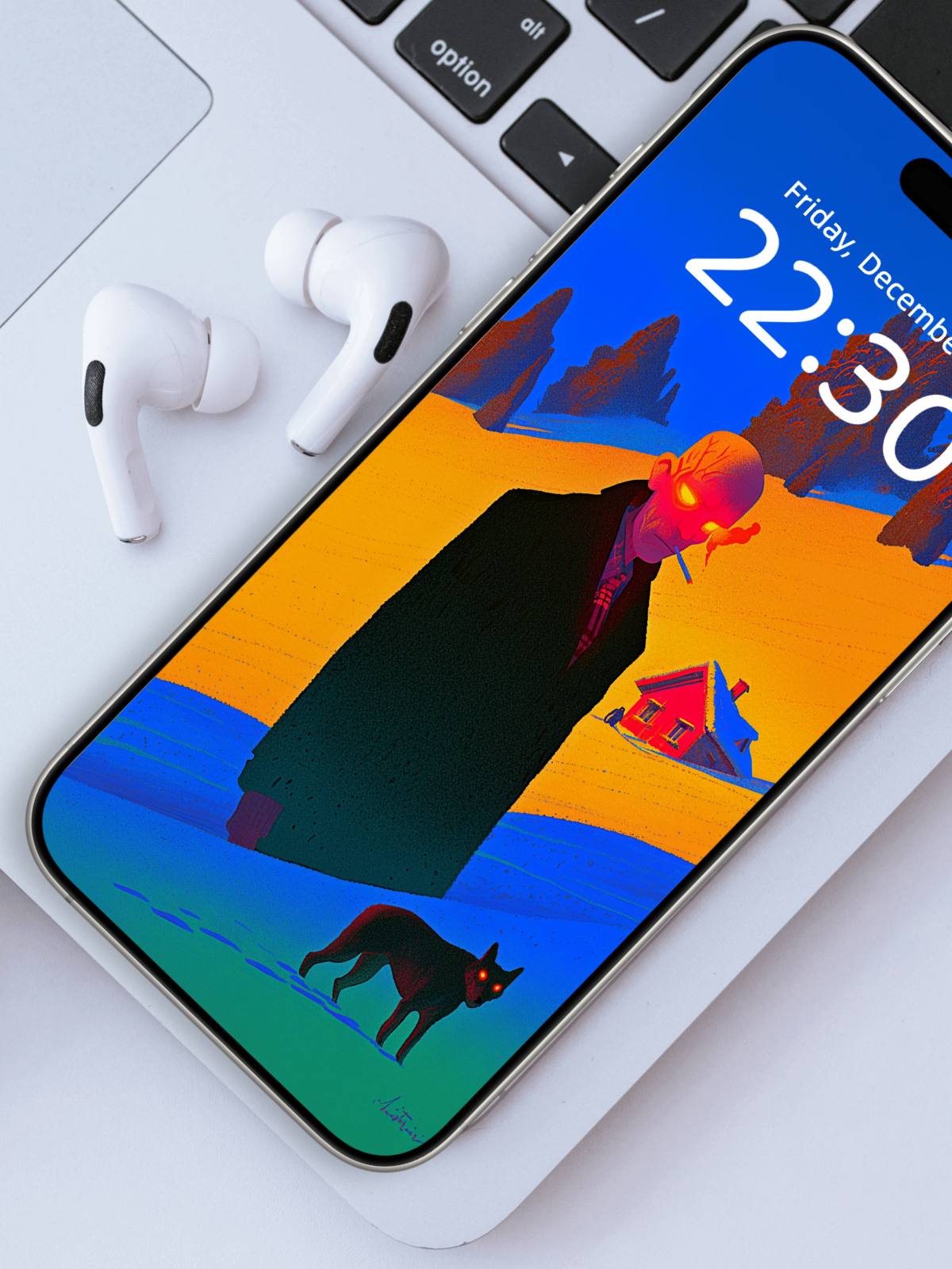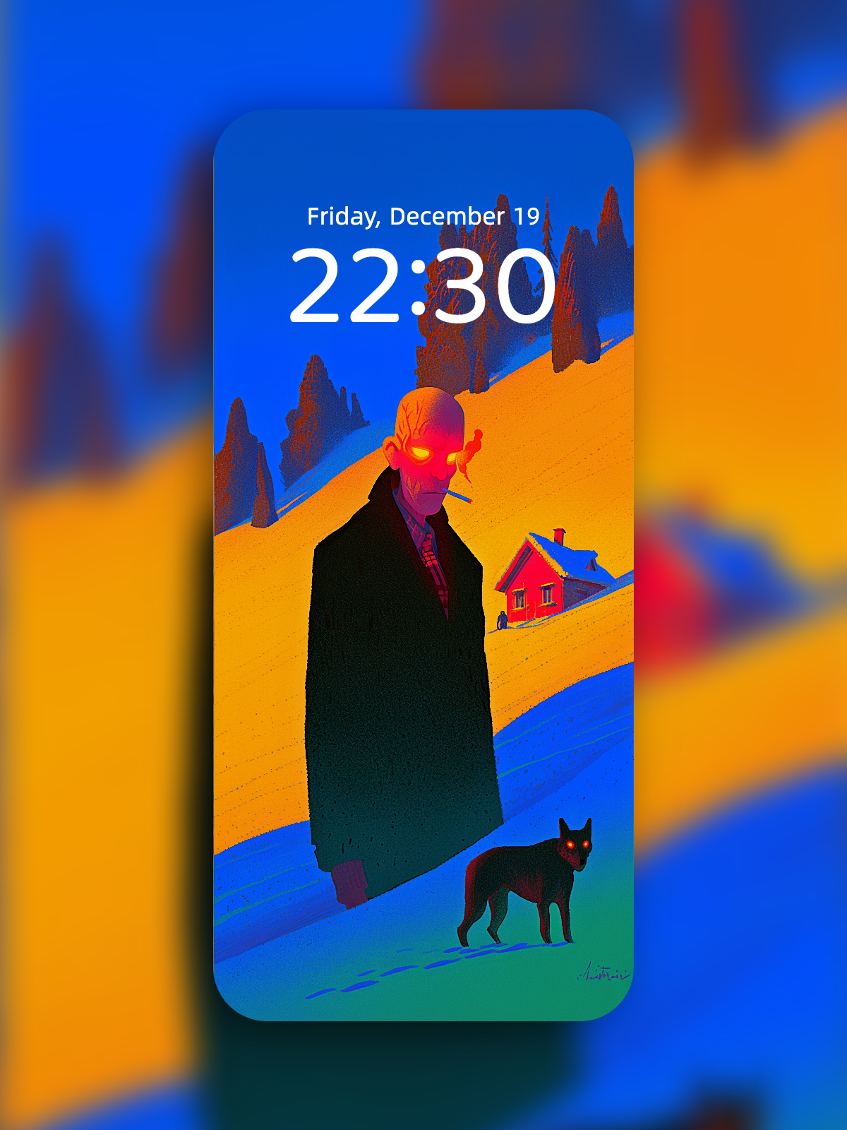 This cinematic winter mobile wallpaper combines solitary figures with diagonal winter landscapes and loyal companions. The glowing red eyes and gold-blue color palette create a perfect atmospheric phone wallpaper for those who love holiday loneliness and emotional guardianship.